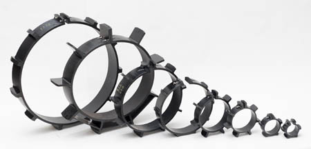 Rörstöden finns i alla standardstorlekar mellan 90 – 1800 mm, samt kan vid behov på 2-3 veckors leveranstid även tillverkas i andra format, ex excentriska rörstöd med lutning- eller multirör-utförande. I sortimentet ingår även ändförslutningar samt kontroll- och överflödningsrör. Vevi rörstöd tillverkas i PE-plast, och stödklackarna svetsas fast i stödringen och fasas av i kanterna för att garantera enkel montering.